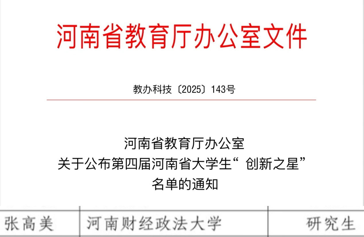 近日,河南省教育厅发布《河南省教育厅办公室关于公布第四届河南省大学生“创新之星”名单的通知》(教办科技〔2025〕143号),经学校初赛、专家评审、省厅决赛、网上公示等环节,认定30位优秀大学生为第四届河南省大学生“创新之星”,其中研究生10名,伟德国际1946bv官网2023级张高美同学成功入选。