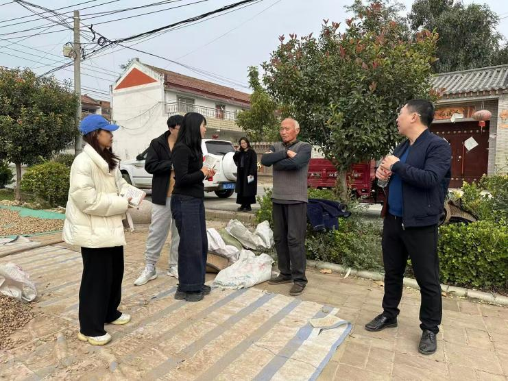 随后,团队深入野岗镇孟庄村农田,实地查看小麦、花生、大蒜三类主粮及经济作物的收获与播种进度。在田间,博士研究生们与农户深入交流,不仅考察连阴雨对作物播种进度、出苗率、长势的直接影响,更聚焦灾情连锁反应:前一茬花生、玉米因阴雨延迟收获、籽粒饱满度下降,部分出现霉变;后一茬小麦、大蒜播种期较往年推迟7-10天,且面临出苗不均的风险。同时,团队还系统收集了农户在排水排涝、病虫害防治、农机调度等方面的实际诉求。